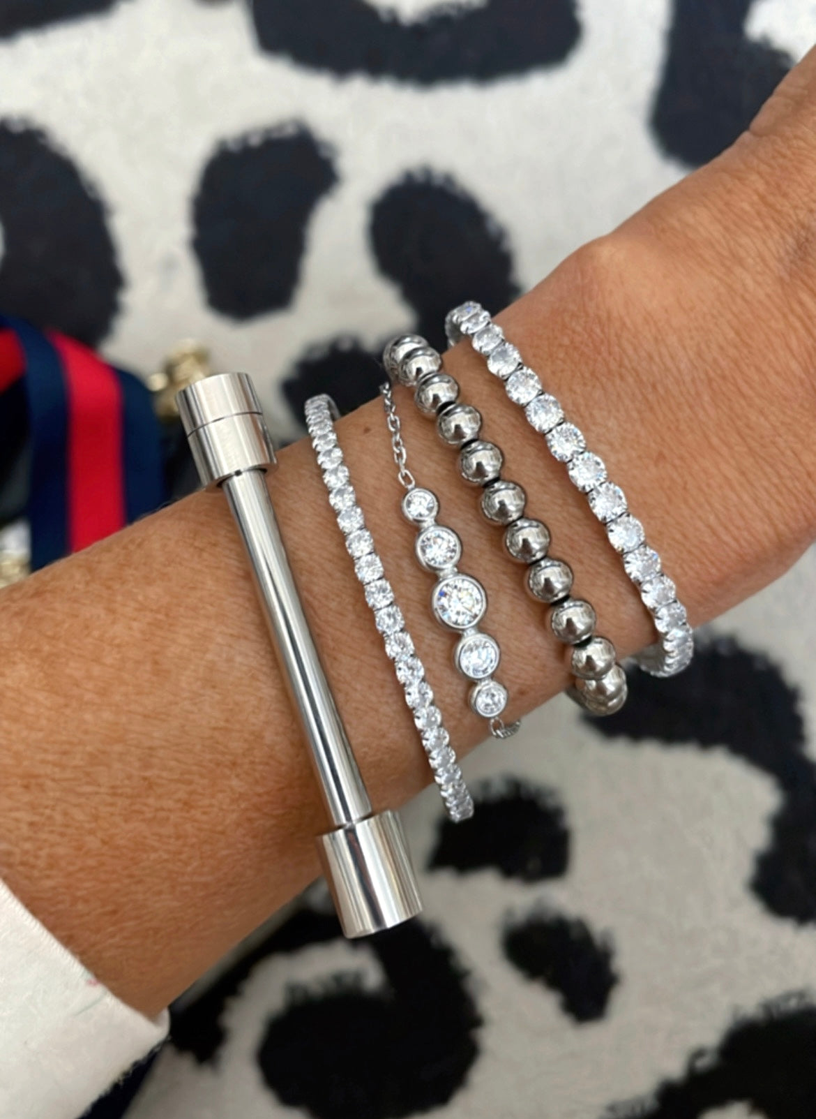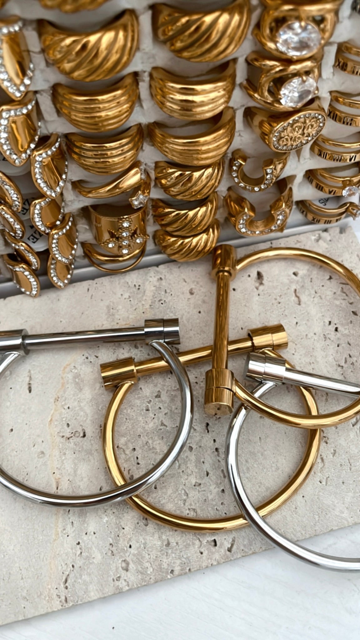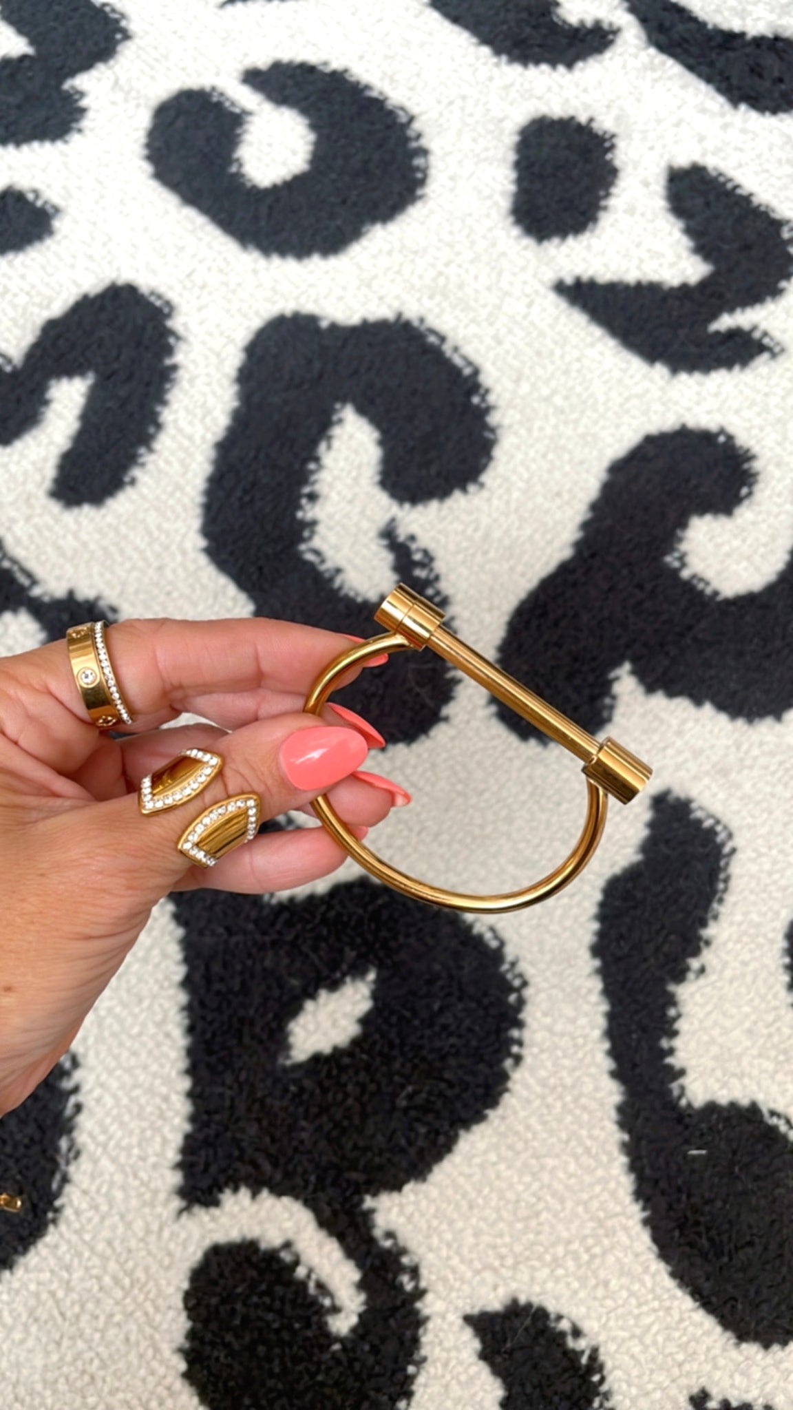 This bracelet is 18 karat gold plated, stainless steel and waterproof. The bar actually screws in and out for accessibility.