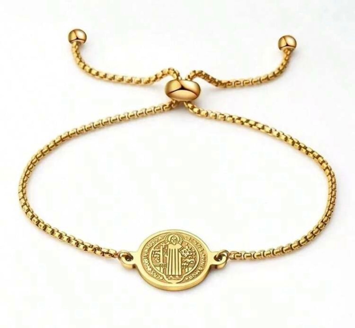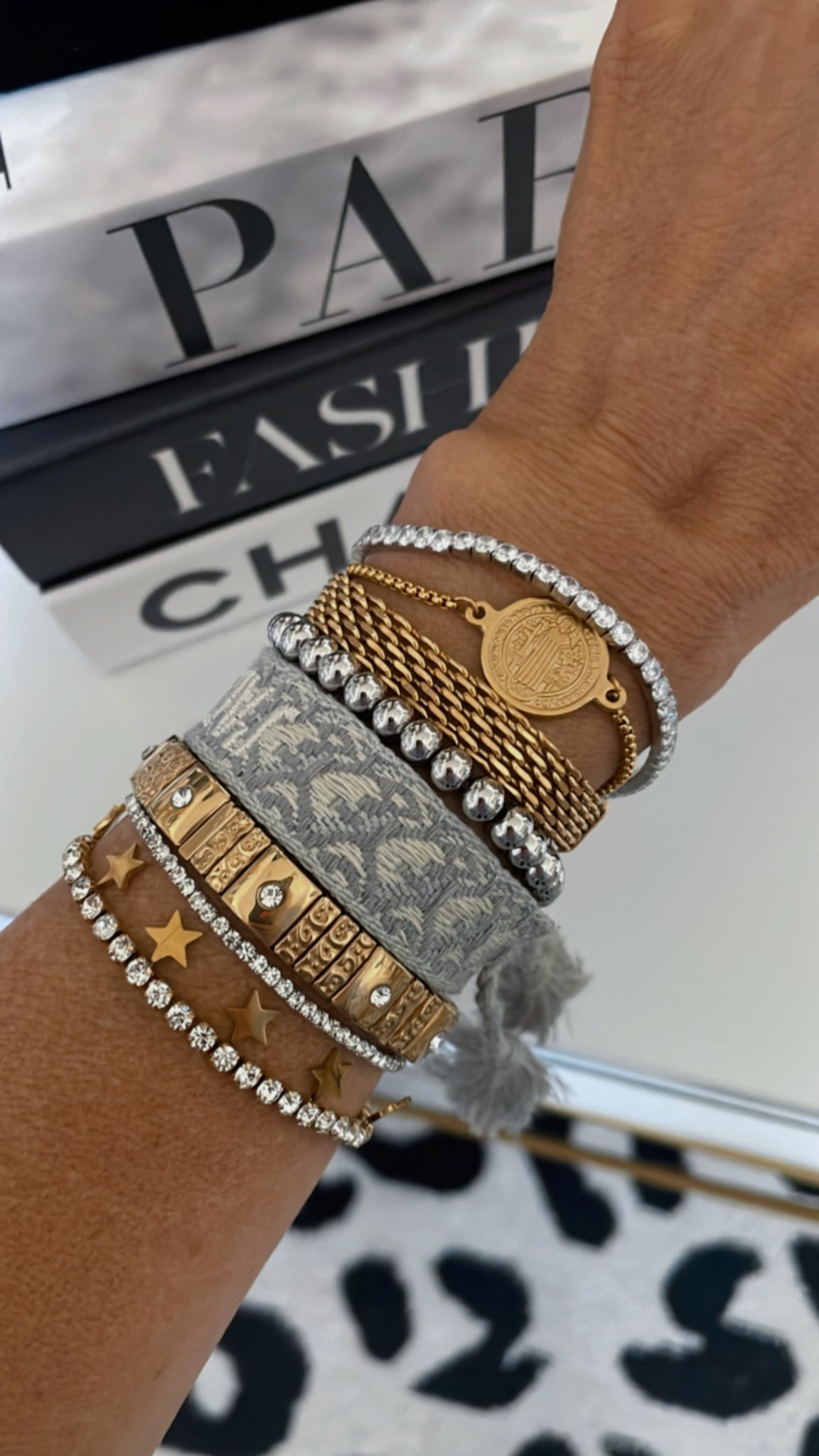 18k gold plated, tarnish resistant and stainless steel. This bracelet is two sided and has such a fun pull tie feature.