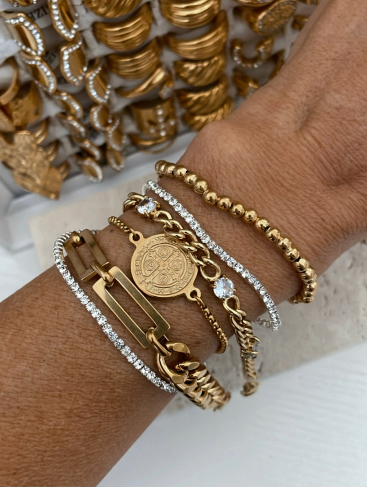 This set includes all 6 pieces! All are 18k gold plated and waterproof except the 2 dainty rhinestone stacking bracelets. Retails over $115