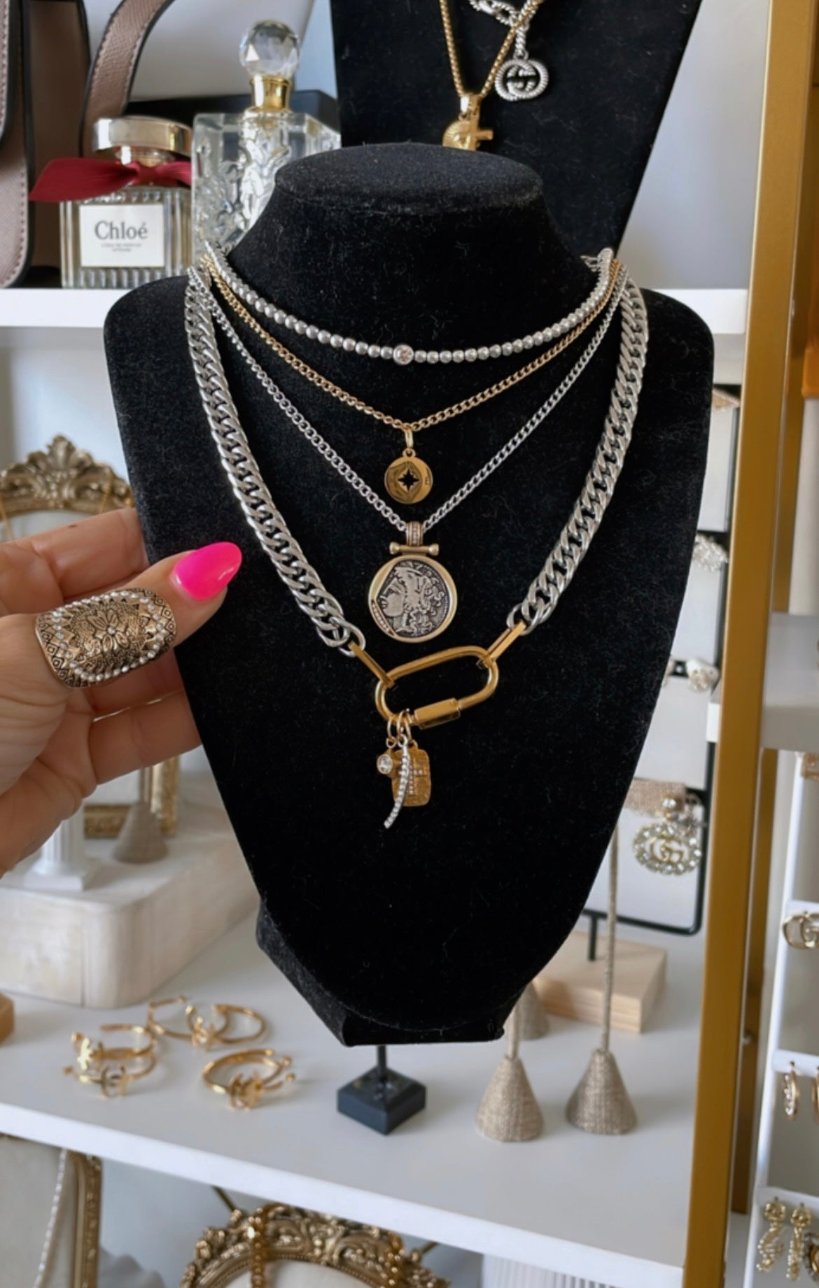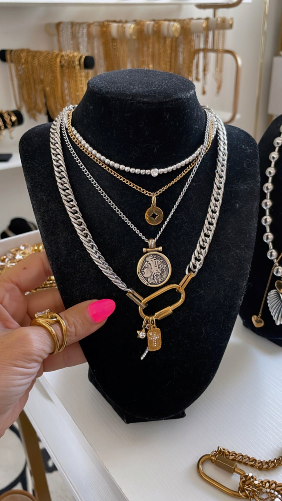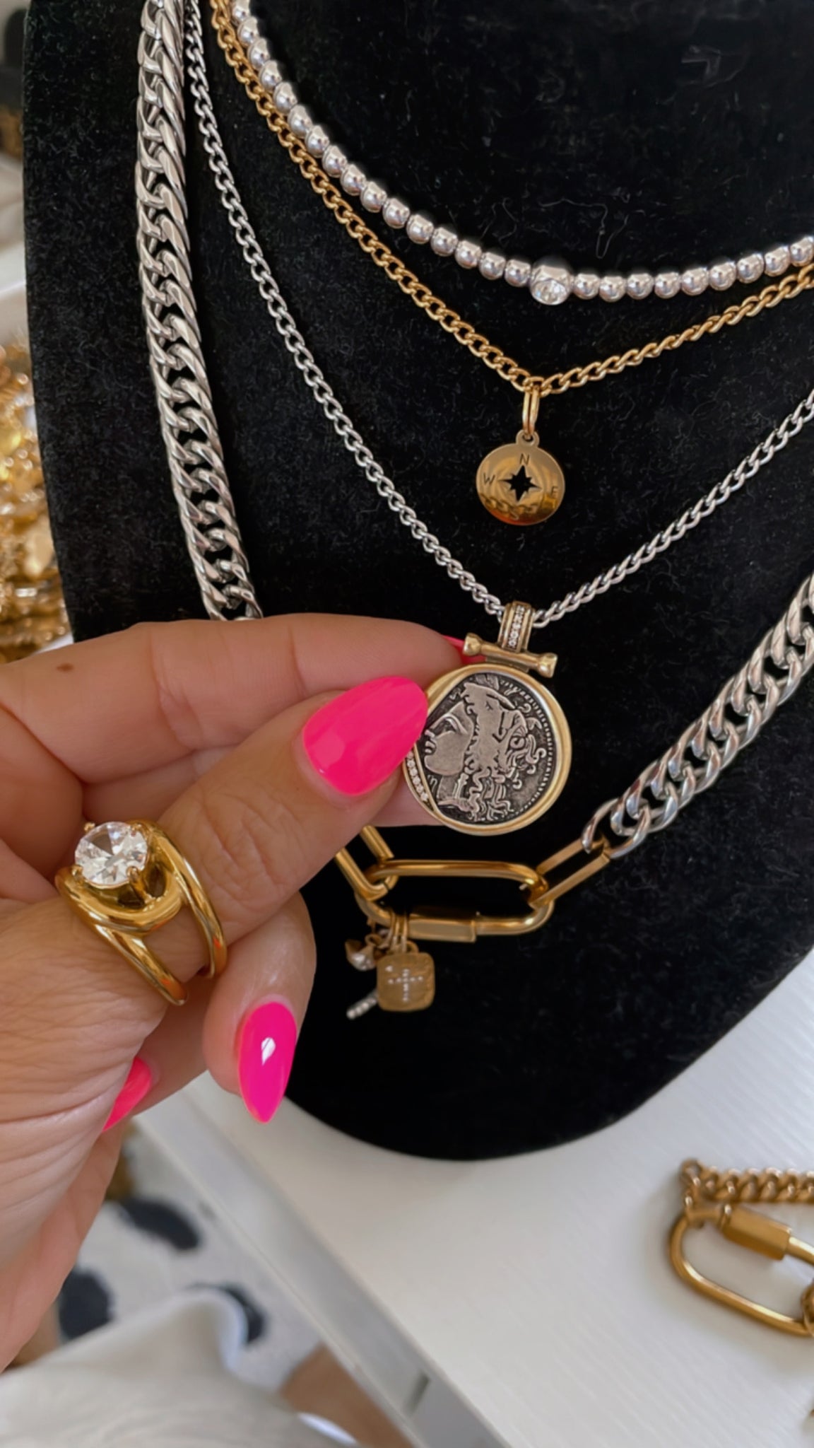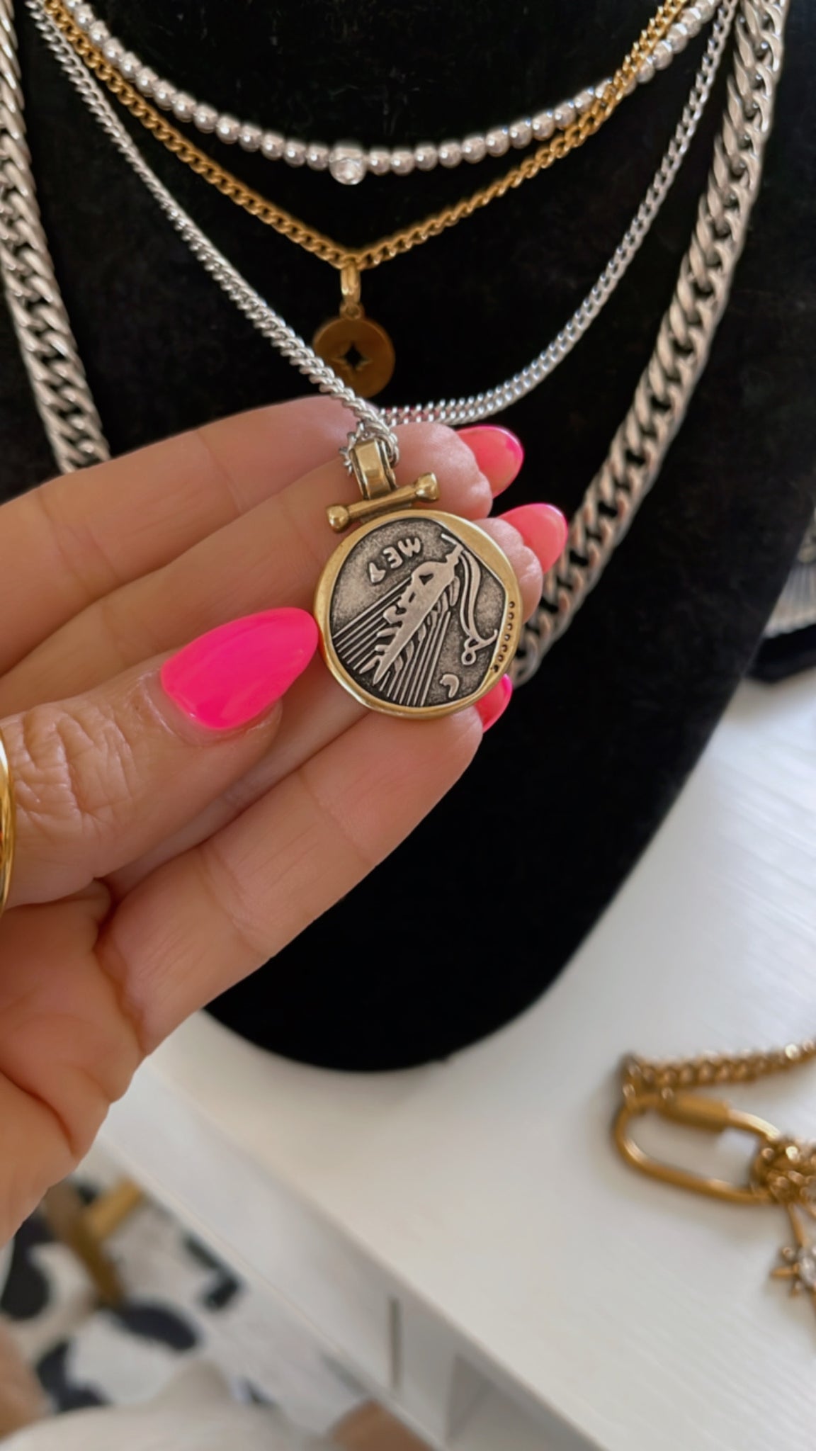 All amazing quality metal. 18k gold plated and/or stainless steel. Many pieces are one of a kind. Obsessed with the funky detail of this two sided coin charm.