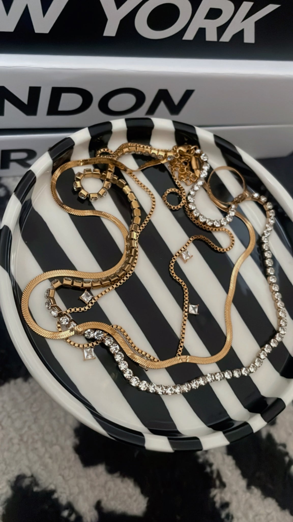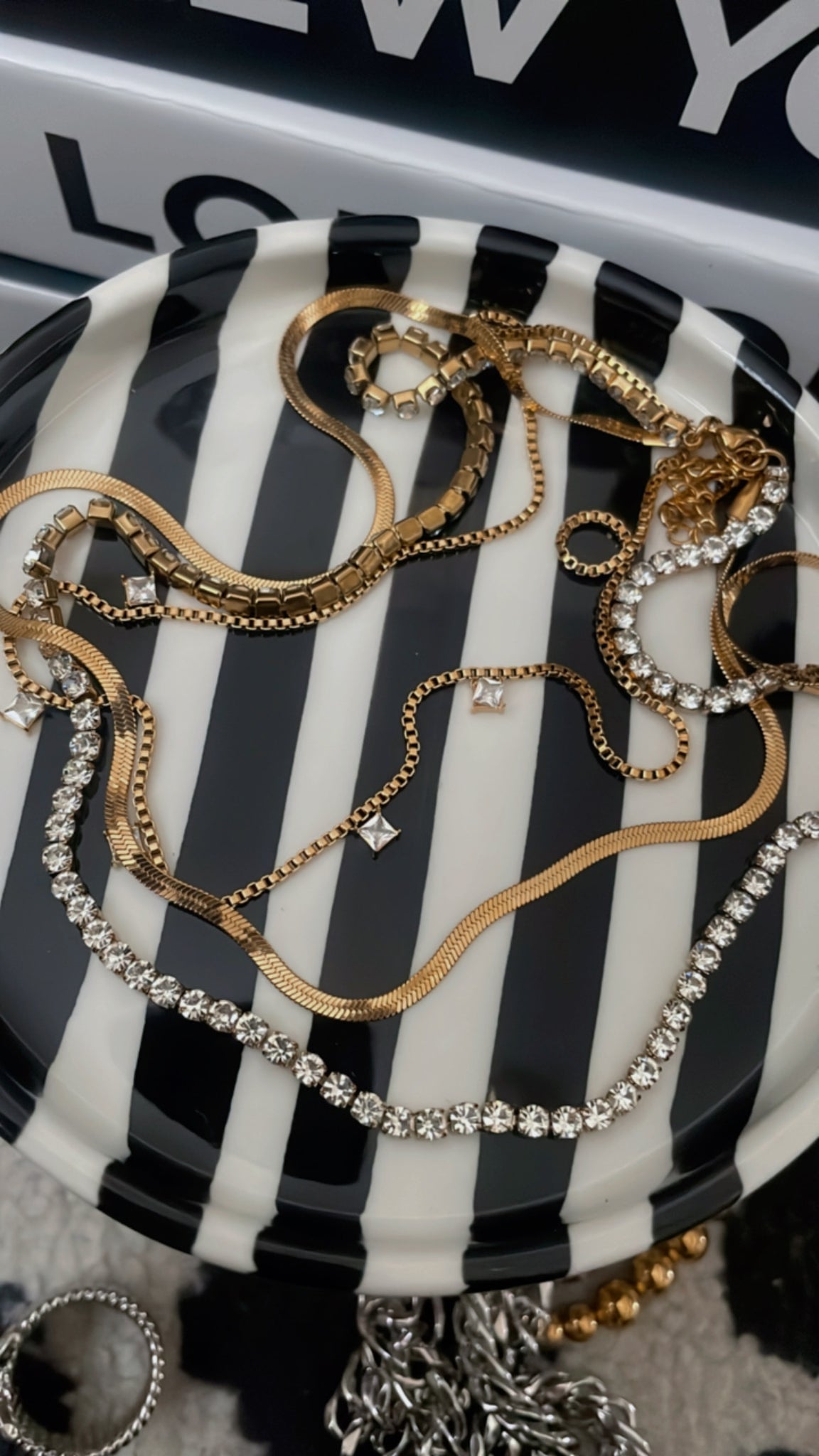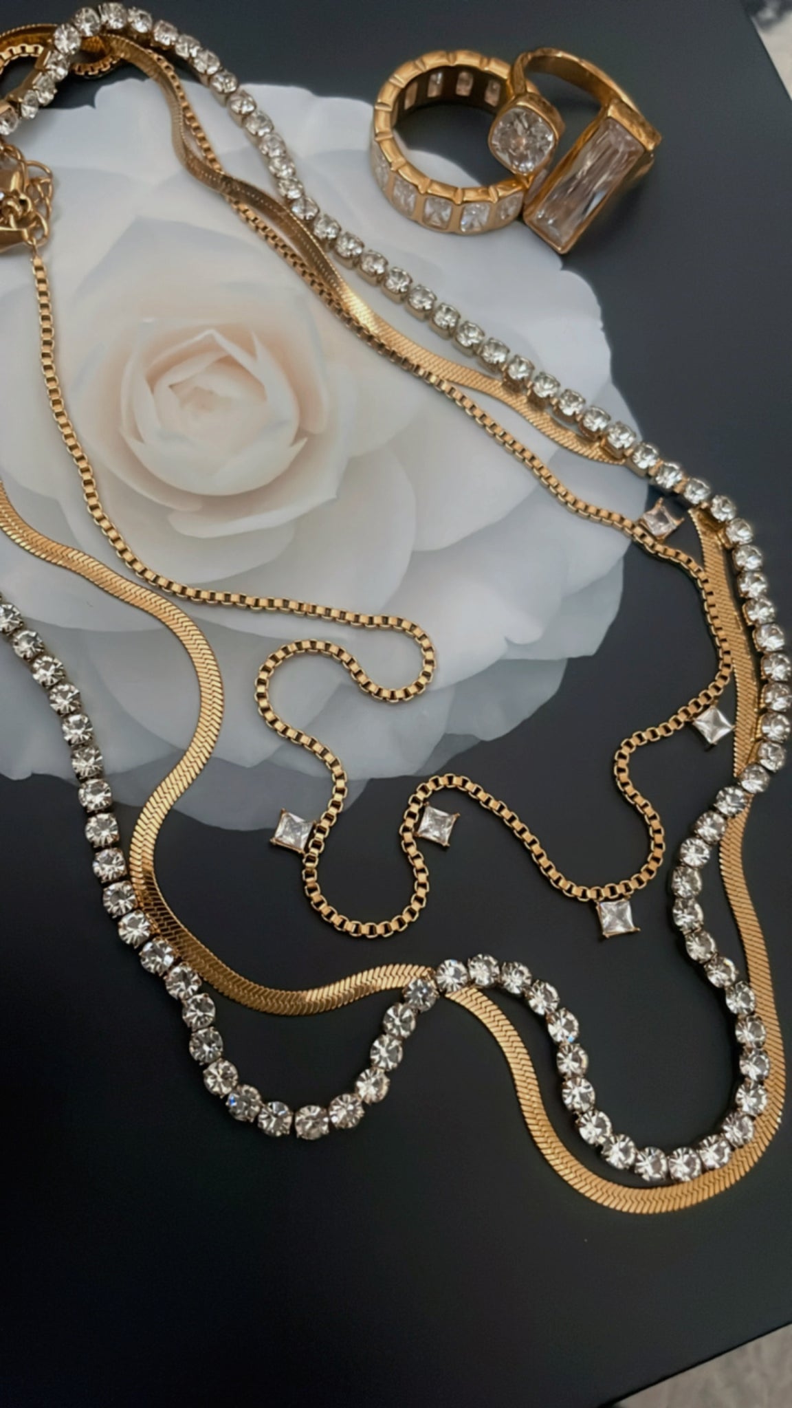 This piece is absolutely gorgeous!! It is 18k gold plated and tarnish resistant. This beauty looks like it is three necklaces, but it is connected with one clap. Perfect for the layering look.